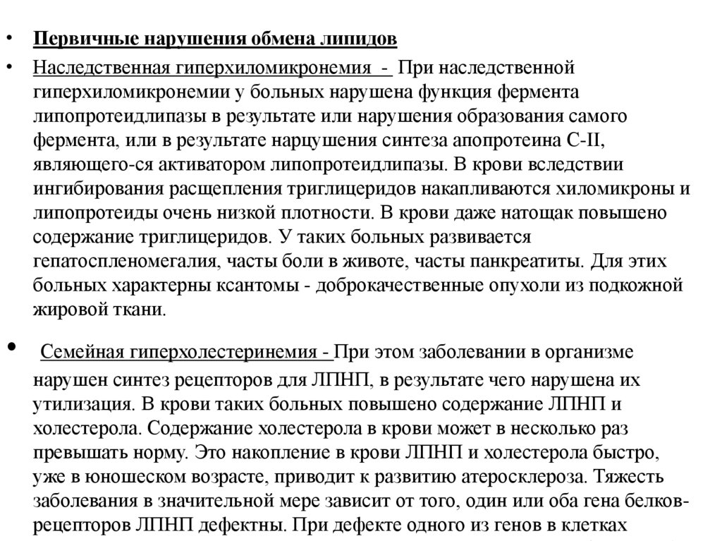• Первичные нарушения обмена липидов• Наследственная гиперхиломикронемия - При наследственной