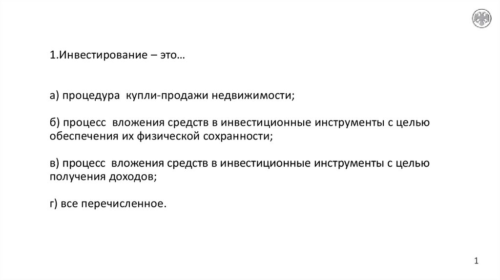 1. 1.Инвестирование – это… а) процедура купли-продажи недвижимости; б) процесс вложения средств в инвестиционные инструменты с