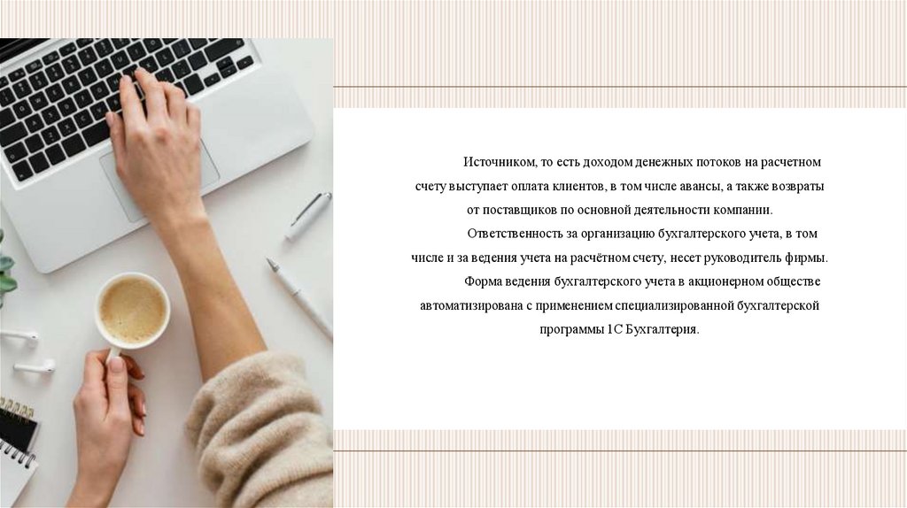 Источником, то есть доходом денежных потоков на расчетномсчету выступает оплата клиентов, в том числе авансы, а также возвраты