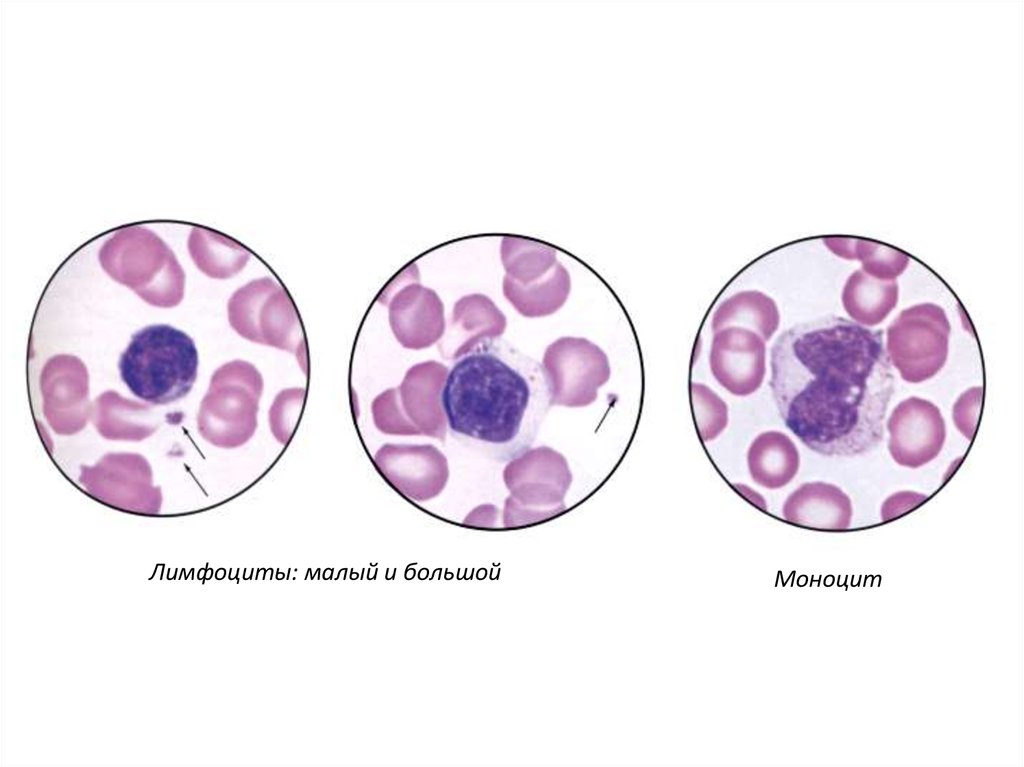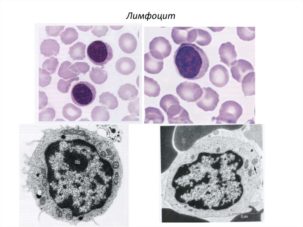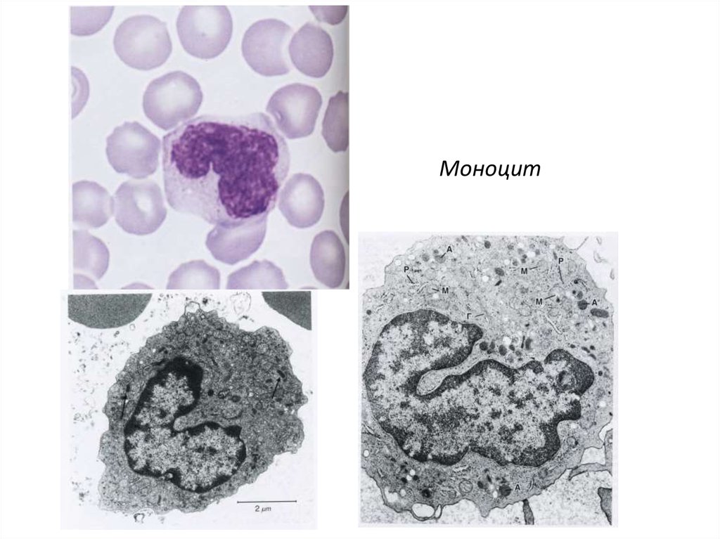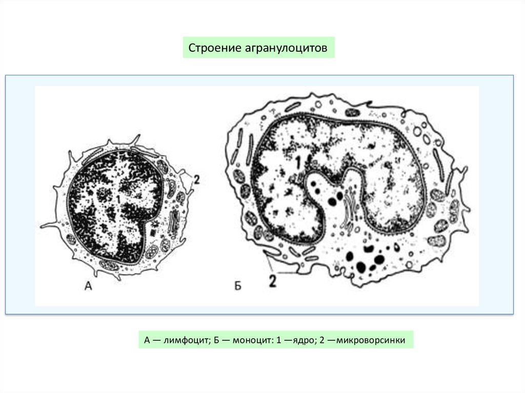 Строение агранулоцитовА — лимфоцит; Б — моноцит: 1 —ядро; 2 —микроворсинки
