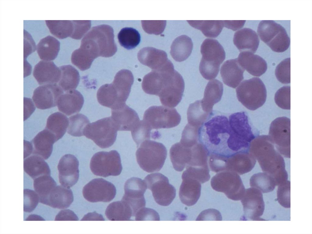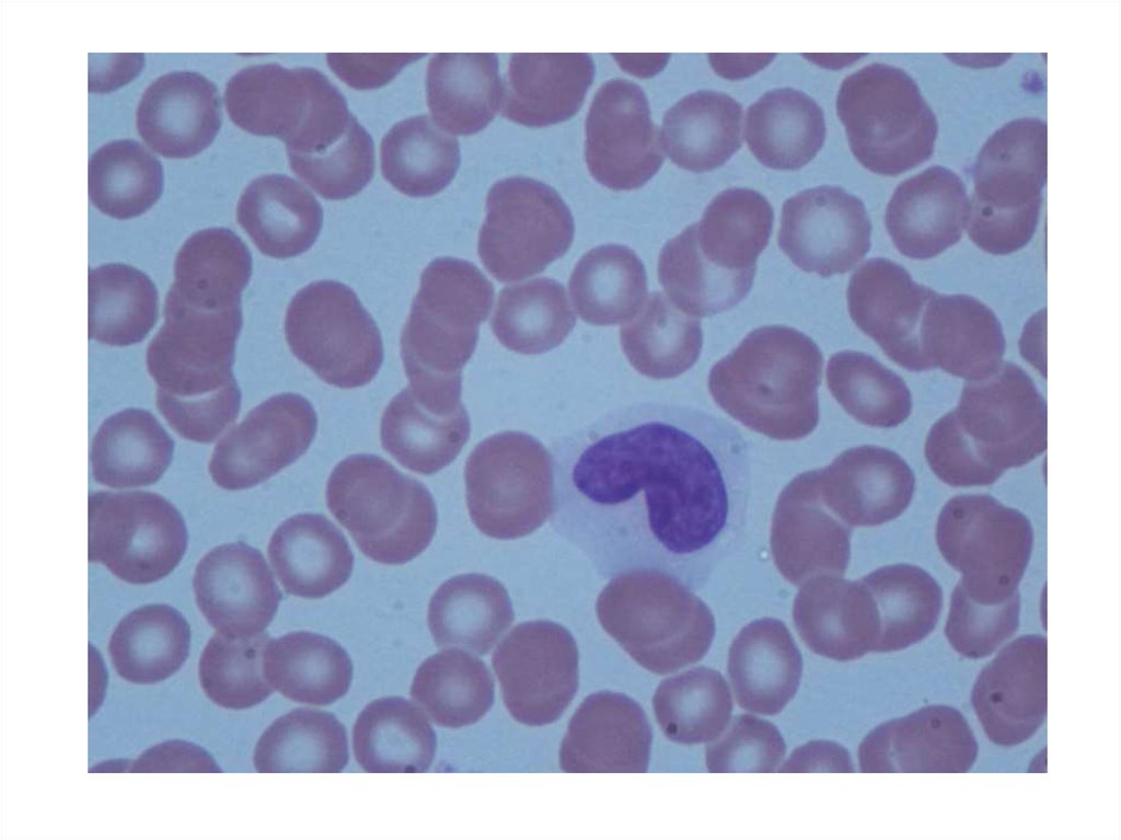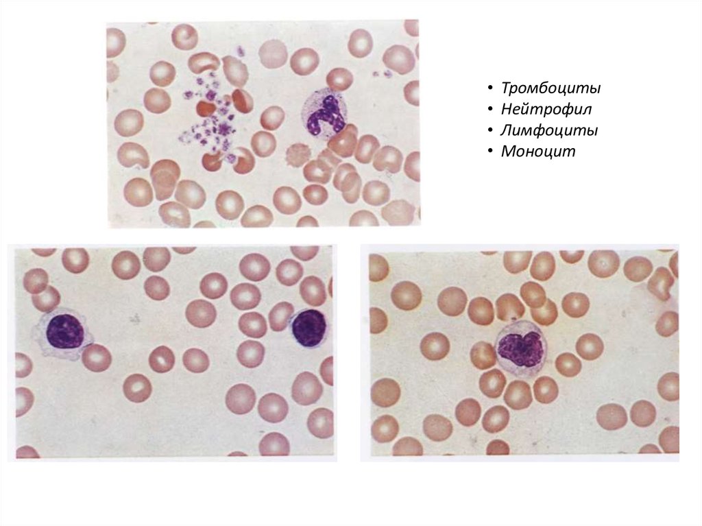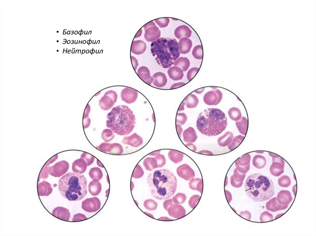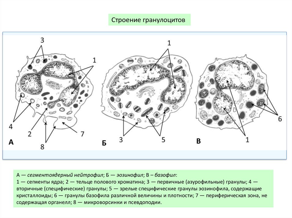 А — сегментоядерный нейтрофил; Б — эозинофил; В – базофил: