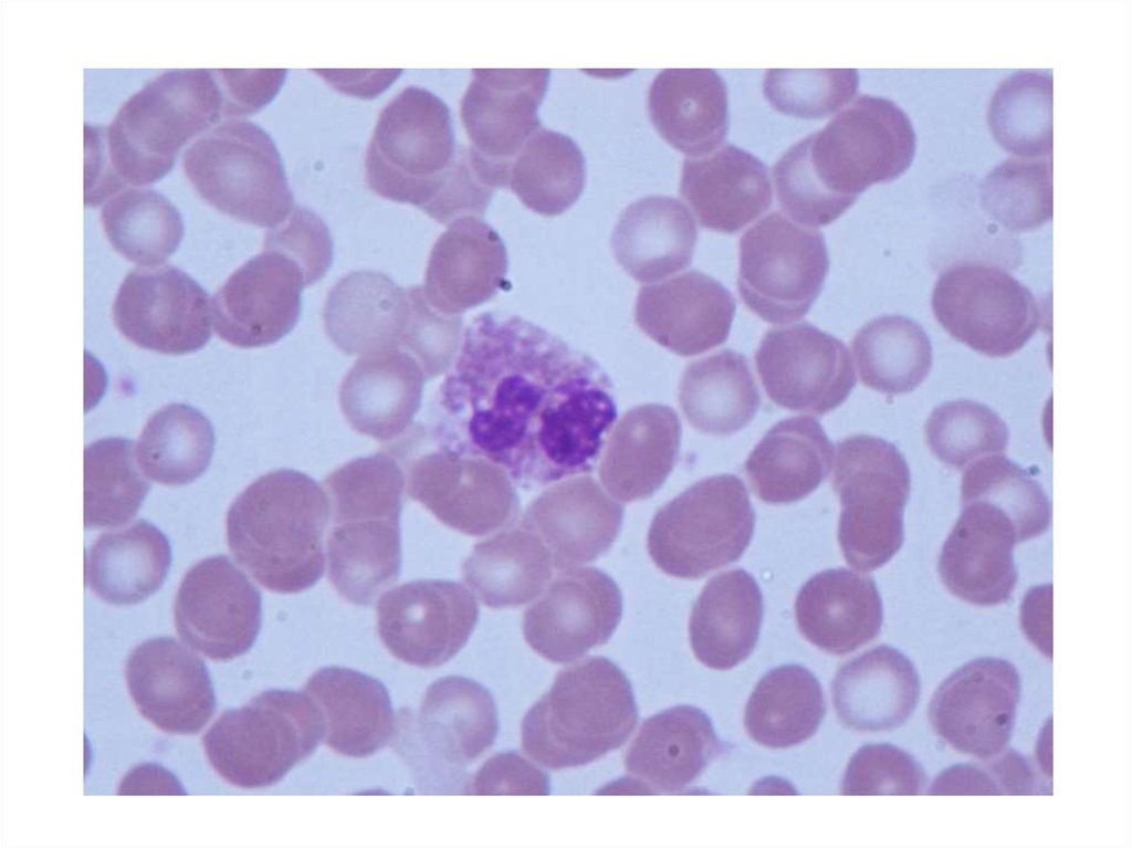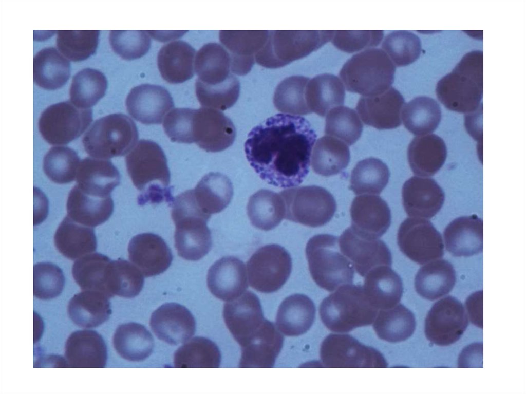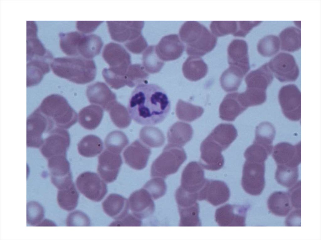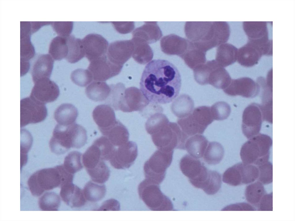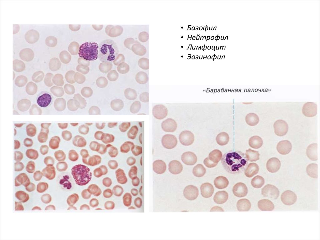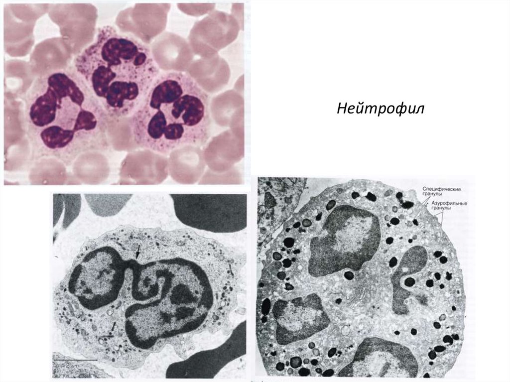 1 — сегменты ядра; 2 — тельце полового хроматина; 3 — первичные (азурофильные) гранулы; 4 —
