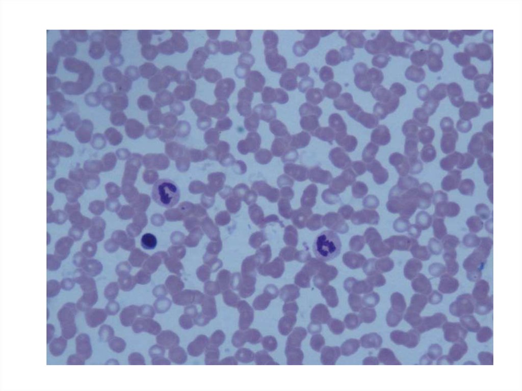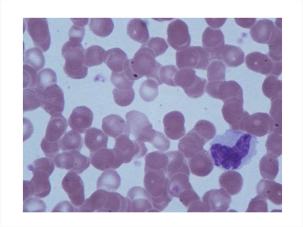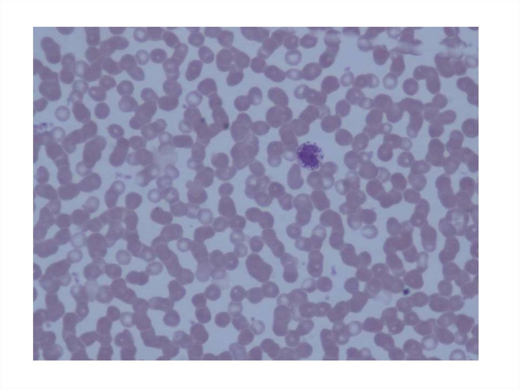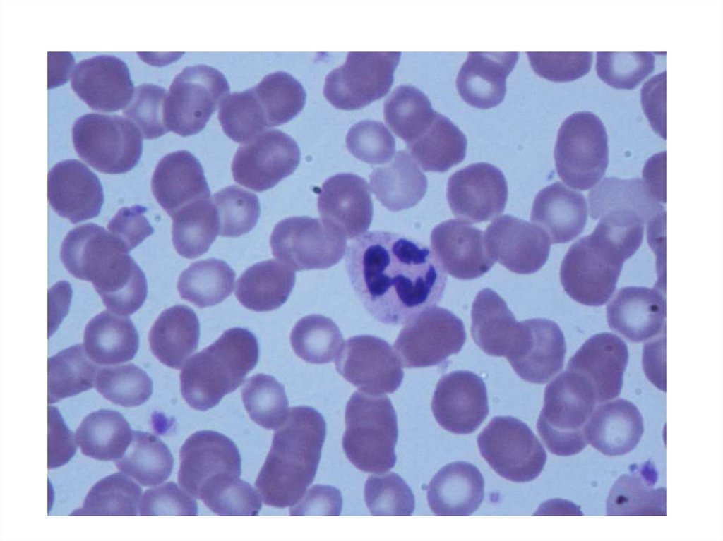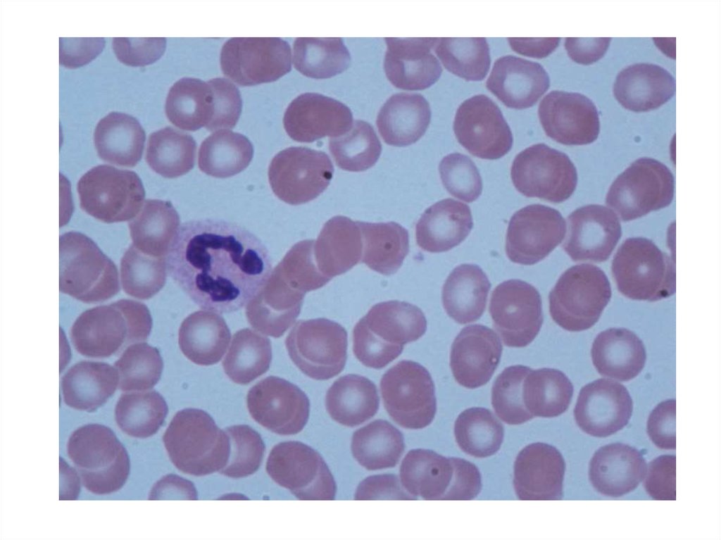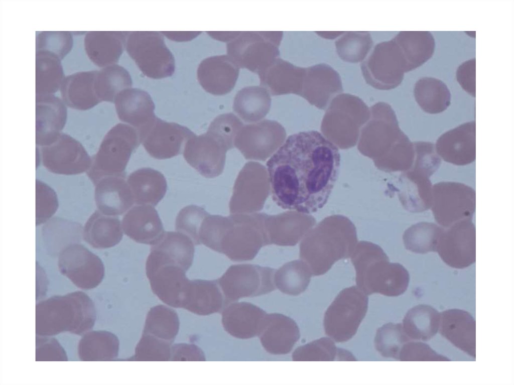 1 — сегменты ядра; 2 — тельце полового хроматина; 3 — первичные (азурофильные) гранулы; 4 —