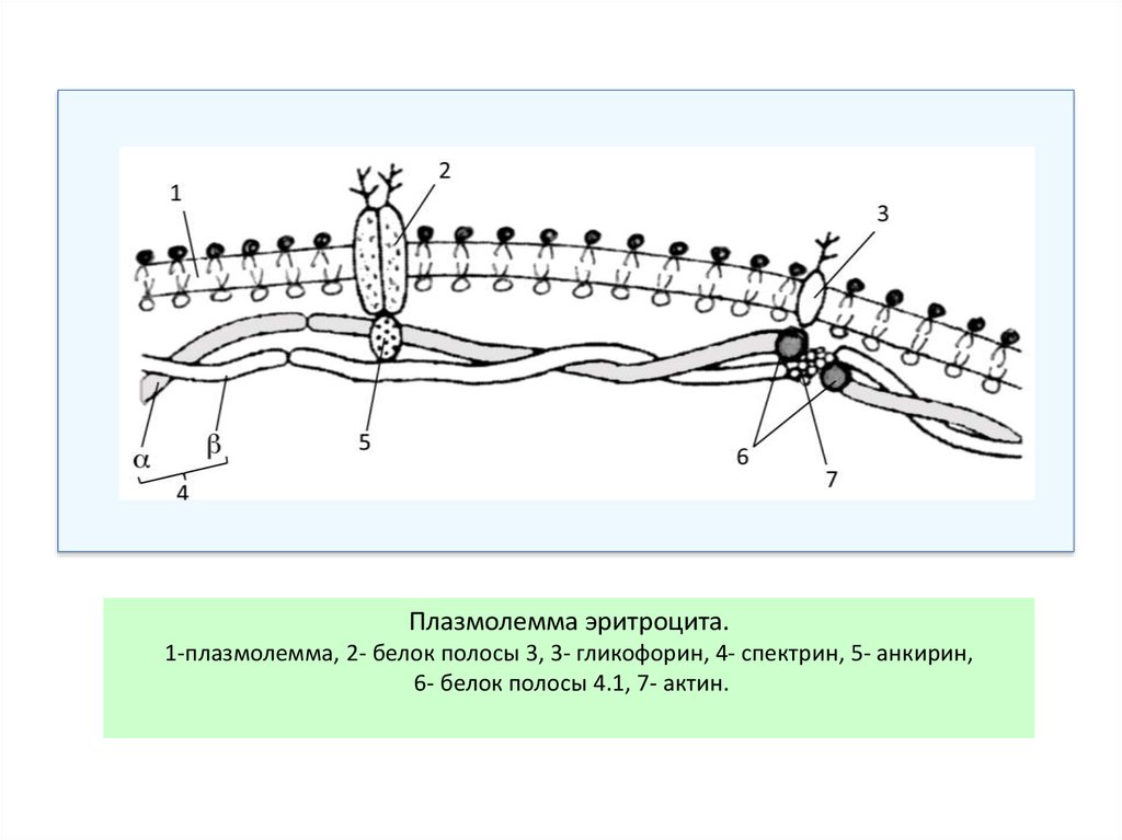Плазмолемма эритроцита.1-плазмолемма, 2- белок полосы 3, 3- гликофорин, 4- спектрин, 5- анкирин,