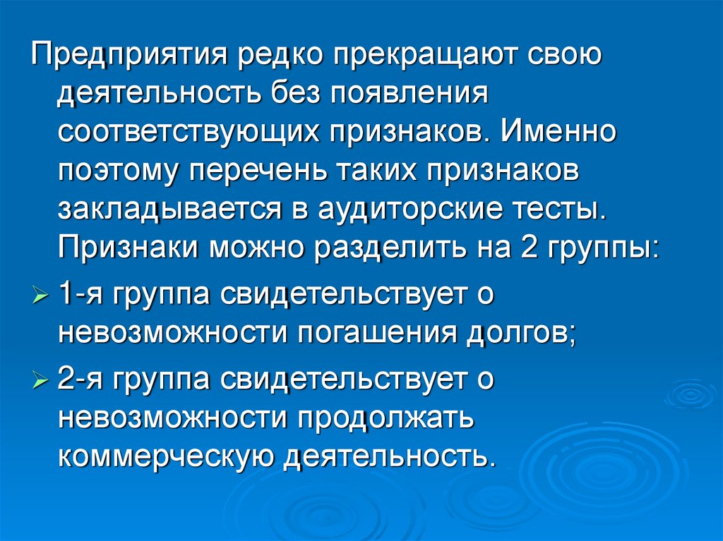 1.Наличие повторяющихся операционных убытков;2.Финансирование за счет просроченной кредиторской