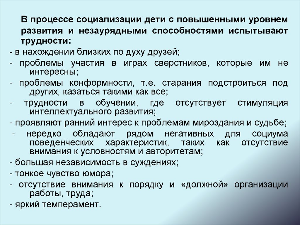 В процессе социализации дети с повышенными уровнемразвития и незаурядными способностями испытывают