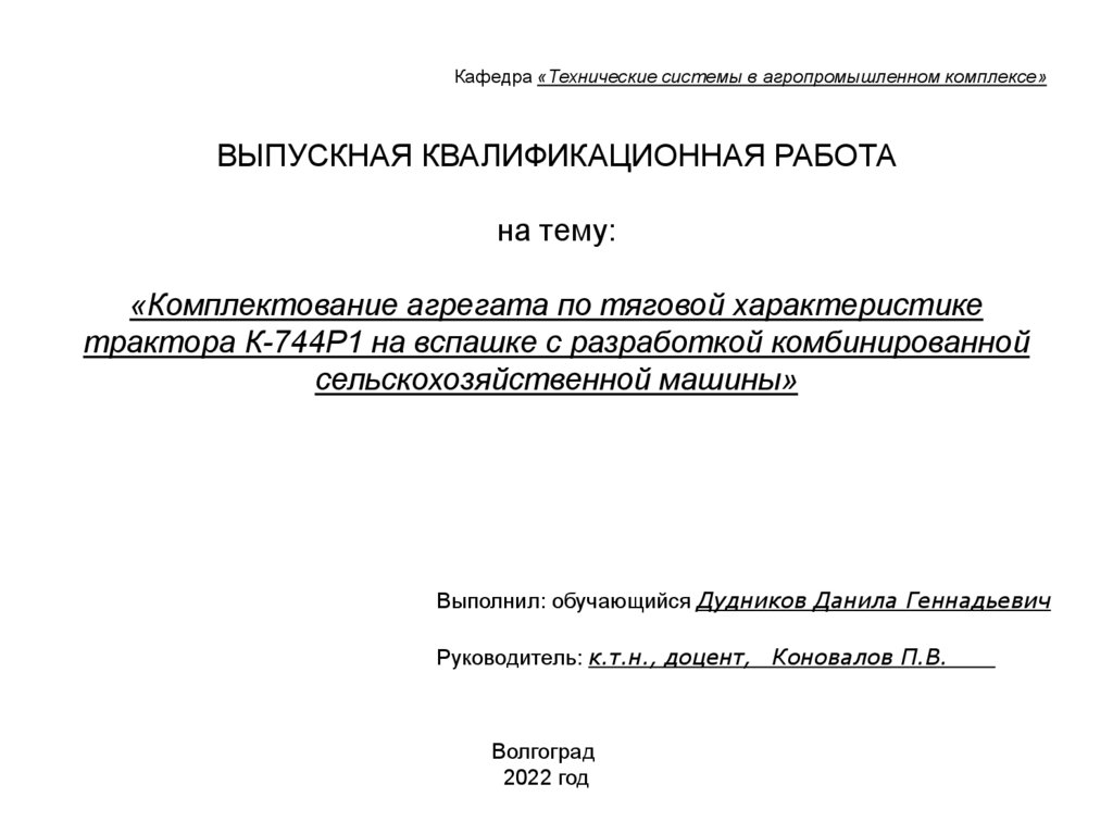 Кафедра «Технические системы в агропромышленном комплексе»ВЫПУСКНАЯ КВАЛИФИКАЦИОННАЯ РАБОТА