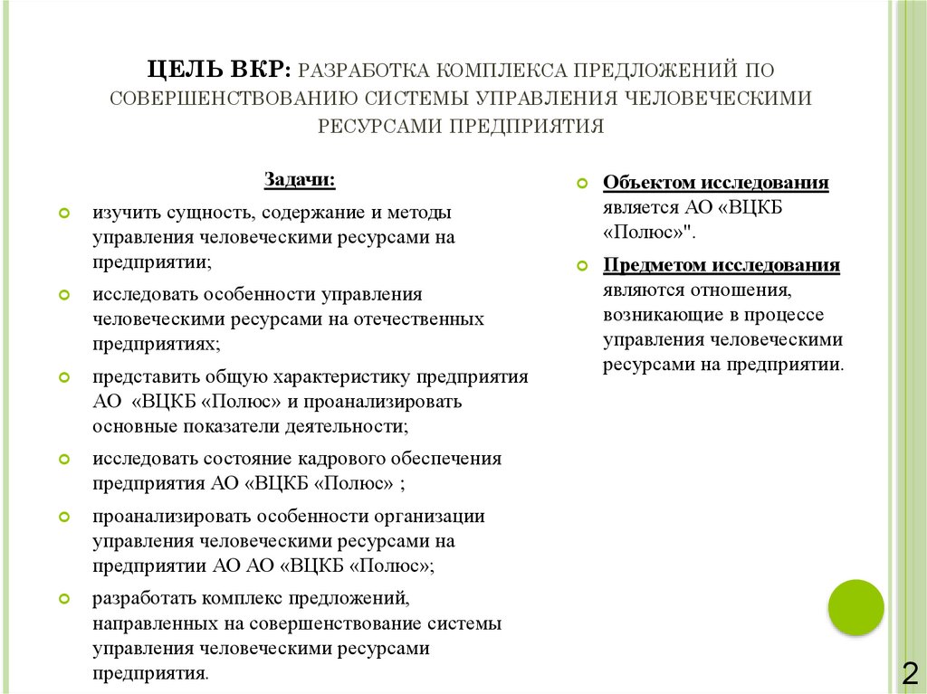 ЦЕЛЬ ВКР: РАЗРАБОТКА КОМПЛЕКСА ПРЕДЛОЖЕНИЙ ПОСОВЕРШЕНСТВОВАНИЮ СИСТЕМЫ УПРАВЛЕНИЯ ЧЕЛОВЕЧЕСКИМИ