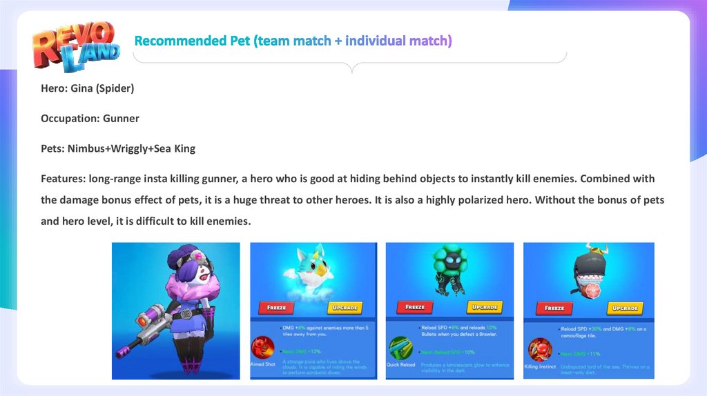 Features: long-range insta killing gunner, a hero who is good at hiding behind objects to instantly kill enemies. Combined with