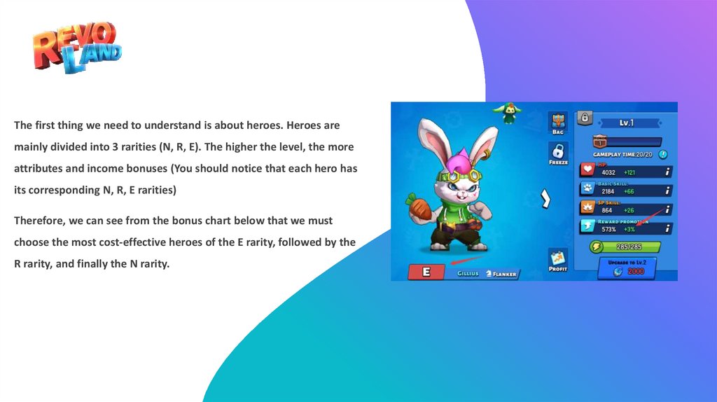 The first thing we need to understand is about heroes. Heroes aremainly divided into 3 rarities (N, R, E). The higher the level, the more