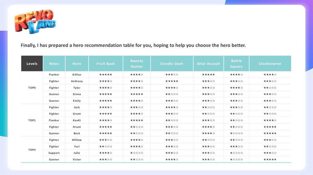 Finally, I has prepared a hero recommendation table for you, hoping to help you choose the hero better.Levels