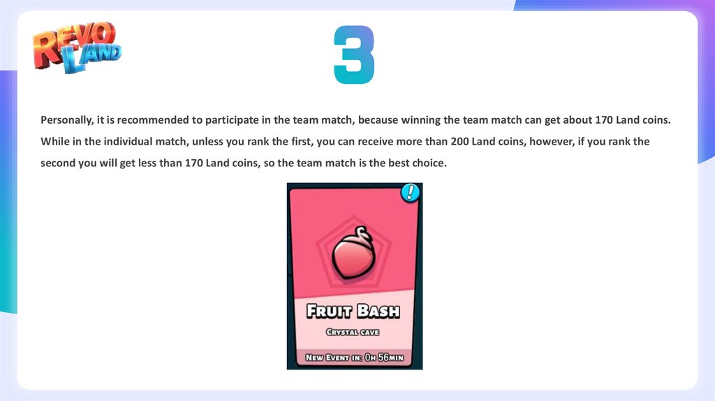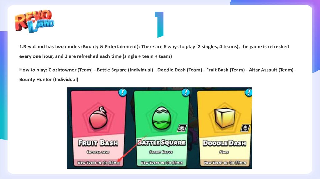 1.RevoLand has two modes (Bounty & Entertainment): There are 6 ways to play (2 singles, 4 teams), the game is refreshedevery one hour, and 3 are refreshed each time (single + team + team)