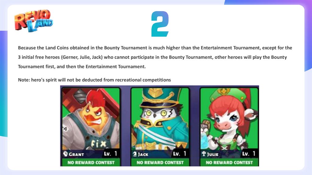 Because the Land Coins obtained in the Bounty Tournament is much higher than the Entertainment Tournament, except for the3 initial free heroes (Gerner, Julie, Jack) who cannot participate in the Bounty Tournament, other heroes will play the Bounty