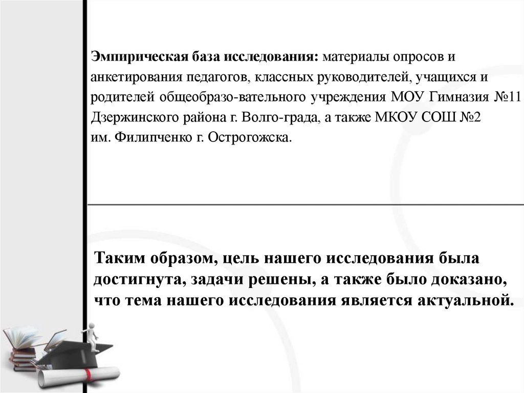 Эмпирическая база исследования: материалы опросов ианкетирования педагогов, классных руководителей, учащихся и
