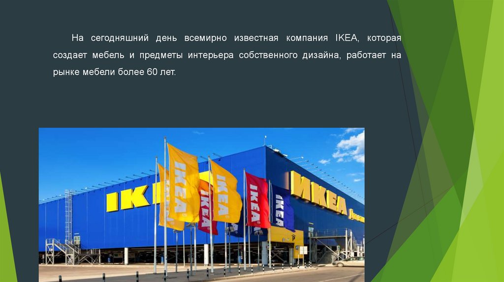 На сегодняшний день всемирно известная компания IKEA, котораясоздает мебель и предметы интерьера собственного дизайна, работает на