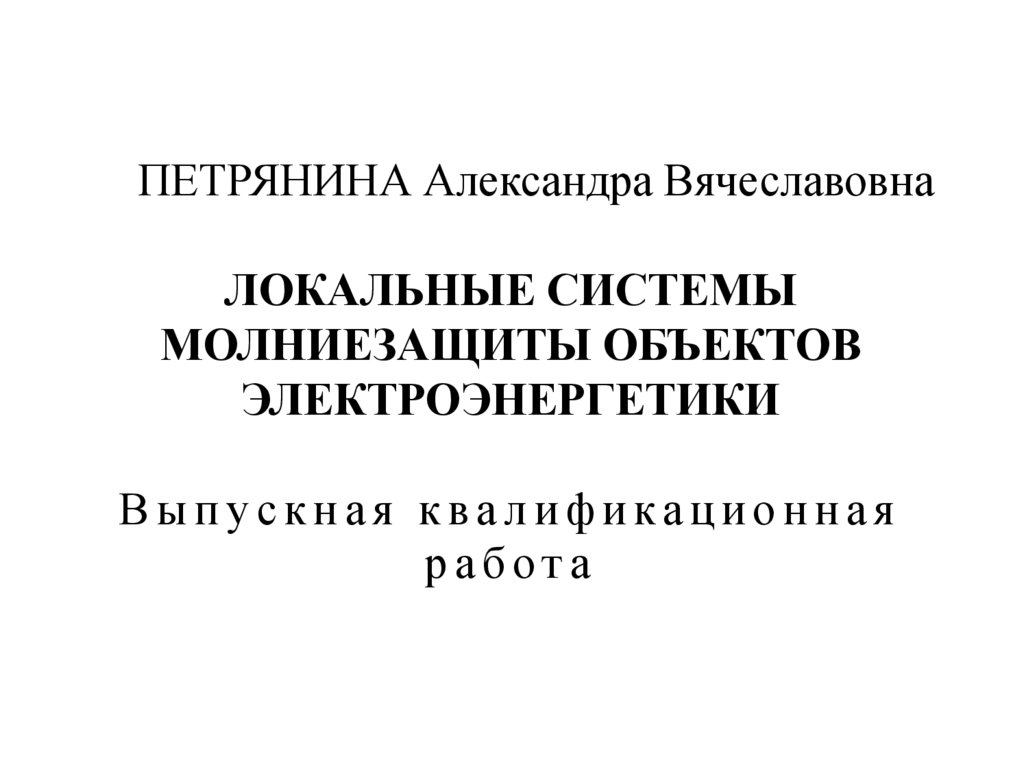1. ПЕТРЯНИНА Александра Вячеславовна ЛОКАЛЬНЫЕ СИСТЕМЫ МОЛНИЕЗАЩИТЫ ОБЪЕКТОВ ЭЛЕКТРОЭНЕРГЕТИКИ Выпускная квалификационная