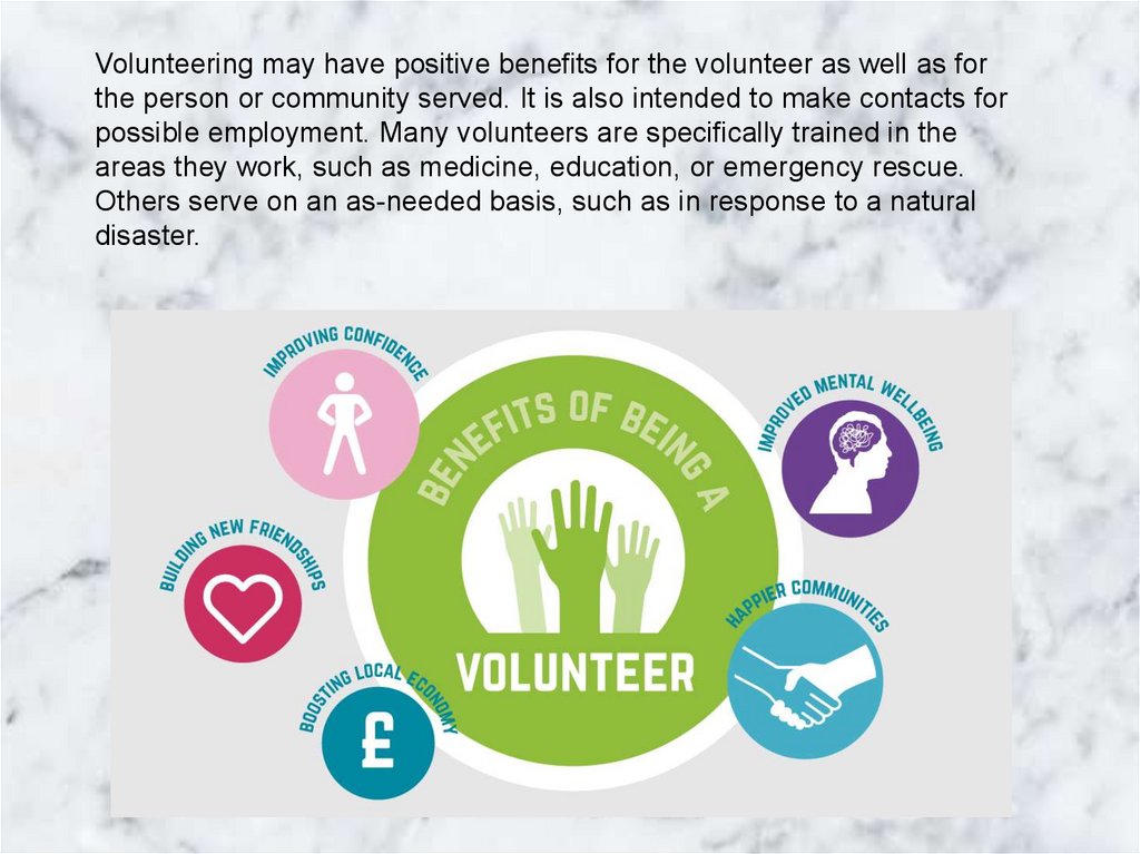 Volunteering may have positive benefits for the volunteer as well as forthe person or community served. It is also intended to make contacts for