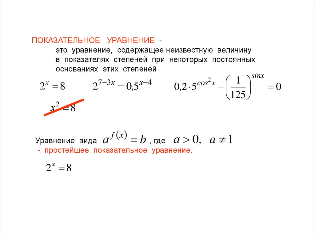 ПОКАЗАТЕЛЬНОЕ УРАВНЕНИЕ это уравнение, содержащее неизвестную величинув показателях степеней при некоторых постоянных