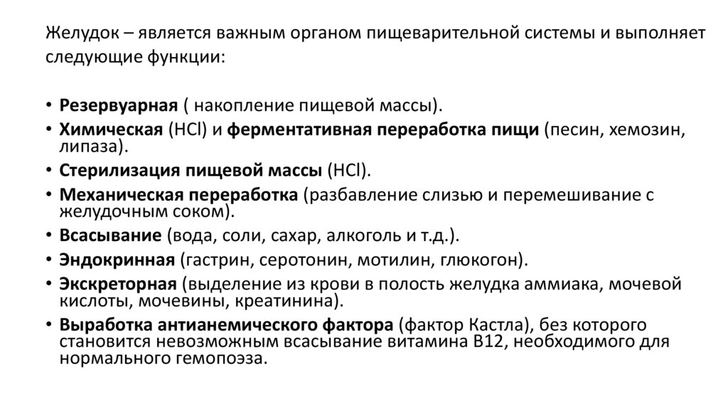 Желудок – является важным органом пищеварительной системы и выполняетследующие функции: