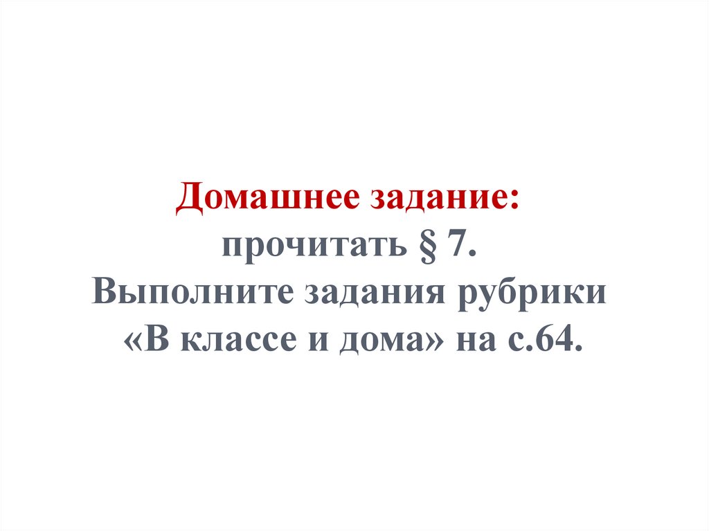 1. Домашнее задание: прочитать § 7. Выполните задания рубрики «В классе и дома» на с.64.