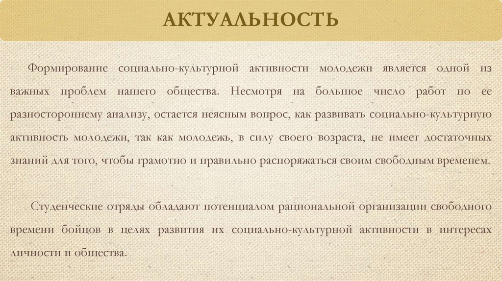 АКТУАЛЬНОСТЬФормирование социально-культурной активности молодежи является одной из