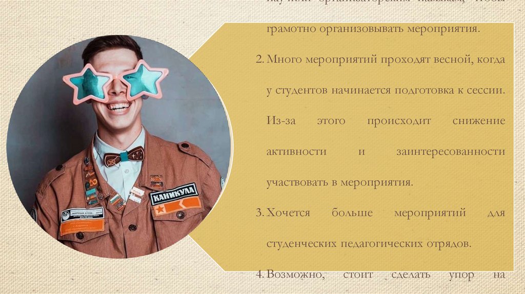 научили организаторским навыкам, чтобыграмотно организовывать мероприятия.