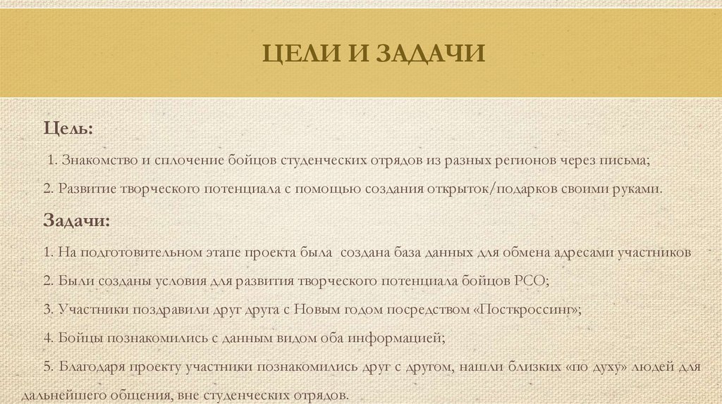 1. Знакомство и сплочение бойцов студенческих отрядов из разных регионов через письма;