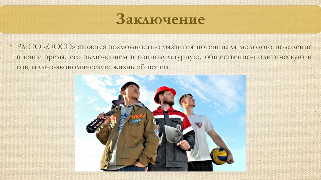 Заключение• РМОО «ООСО» является возможностью развития потенциала молодого поколения
