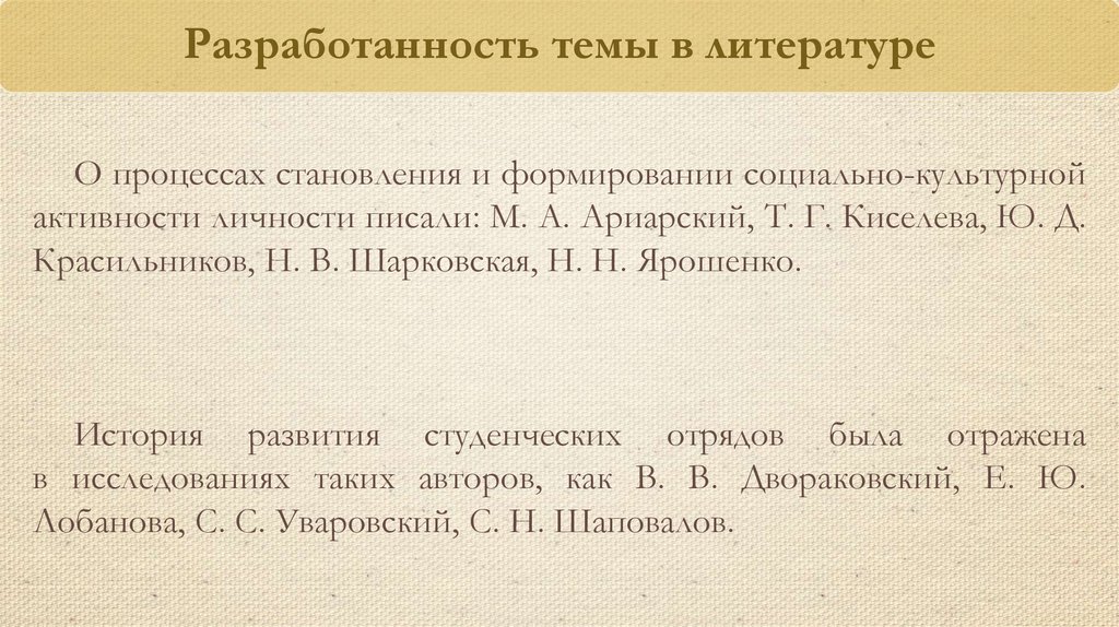 Разработанность темы в литературеО процессах становления и формировании социально-культурной