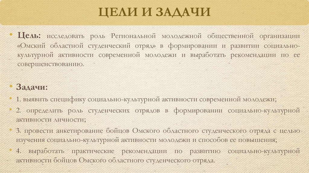 • 2. определить роль студенческих отрядов в формировании социально-культурной