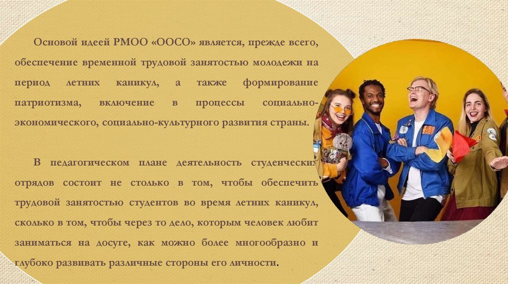 Основой идеей РМОО «ООСО» является, прежде всего,обеспечение временной трудовой занятостью молодежи на