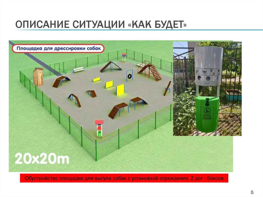 ОПИСАНИЕ СИТУАЦИИ «КАК БУДЕТ»Обустройство площадки для выгула собак с установкой ограждения, 2 дог - боксов