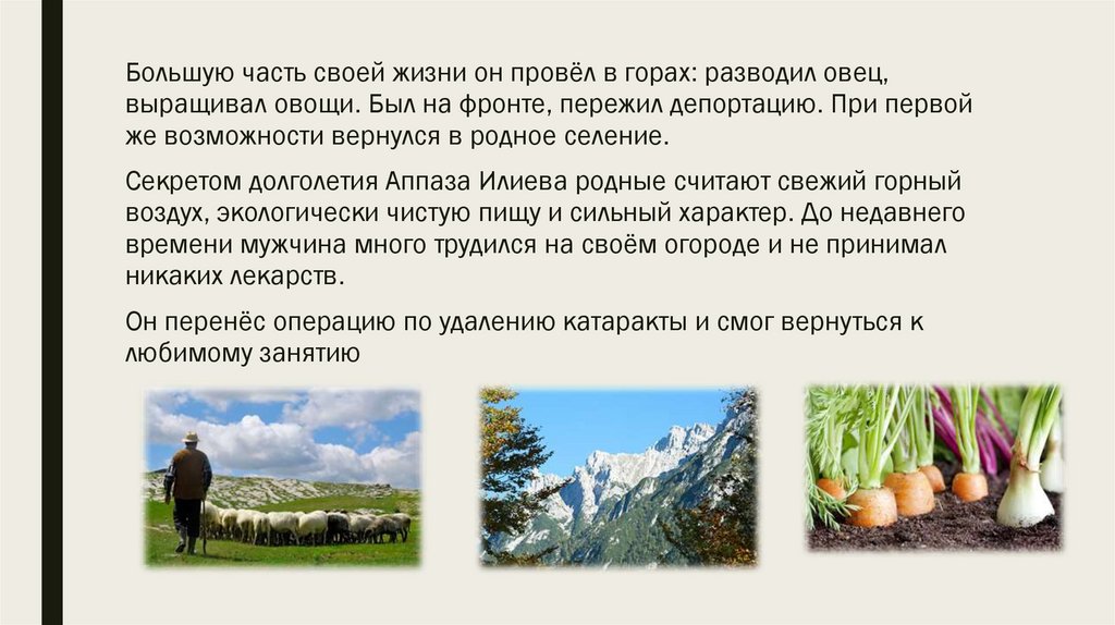 Большую часть своей жизни он провёл в горах: разводил овец,выращивал овощи. Был на фронте, пережил депортацию. При первой