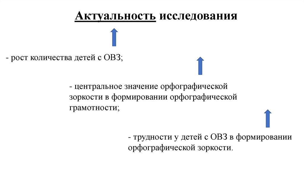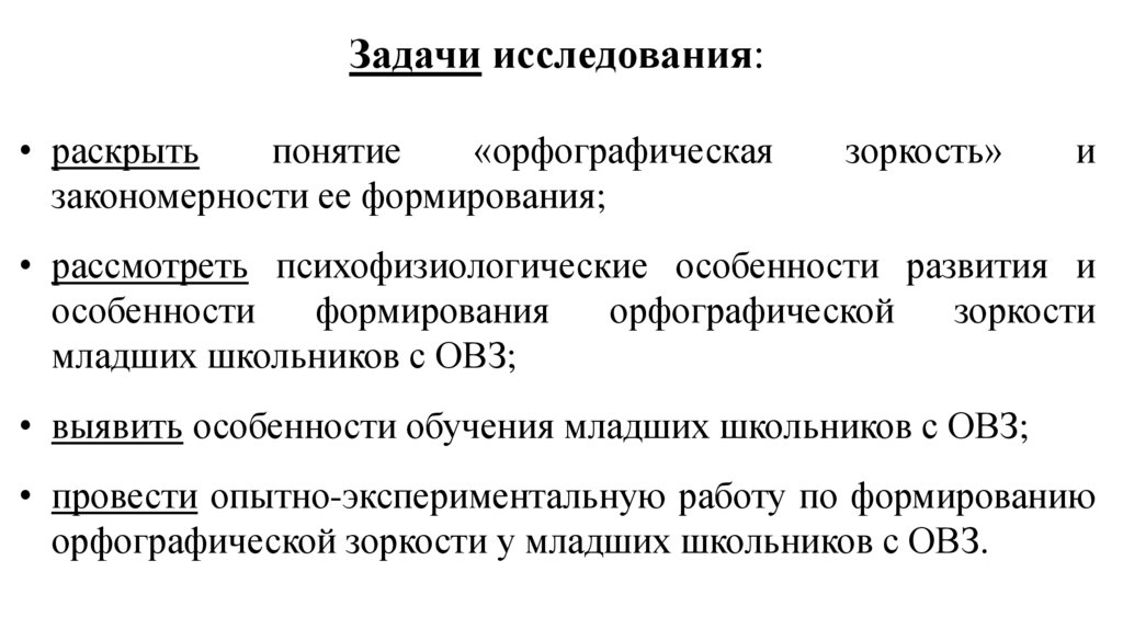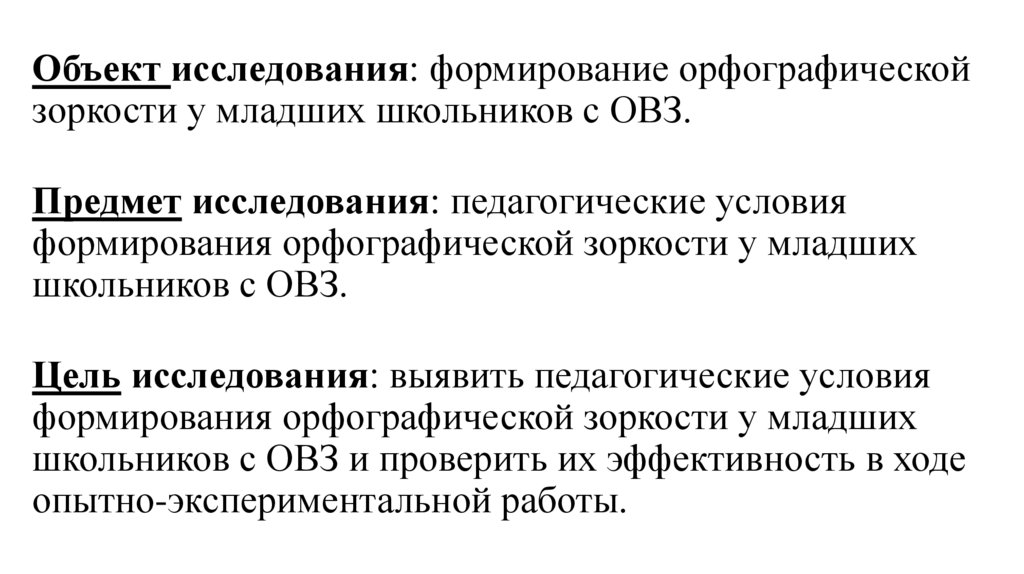 Объект исследования: формирование орфографическойзоркости у младших школьников с ОВЗ.