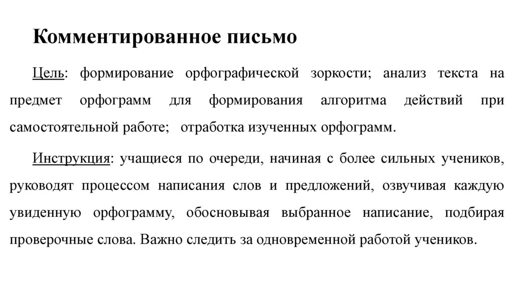 Комментированное письмоЦель: формирование орфографической зоркости; анализ текста на