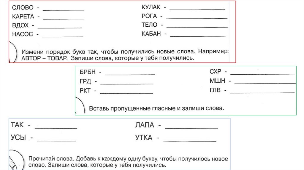 • вариант 1 – «Переставь буквы так, чтобы получилось новое слово»;