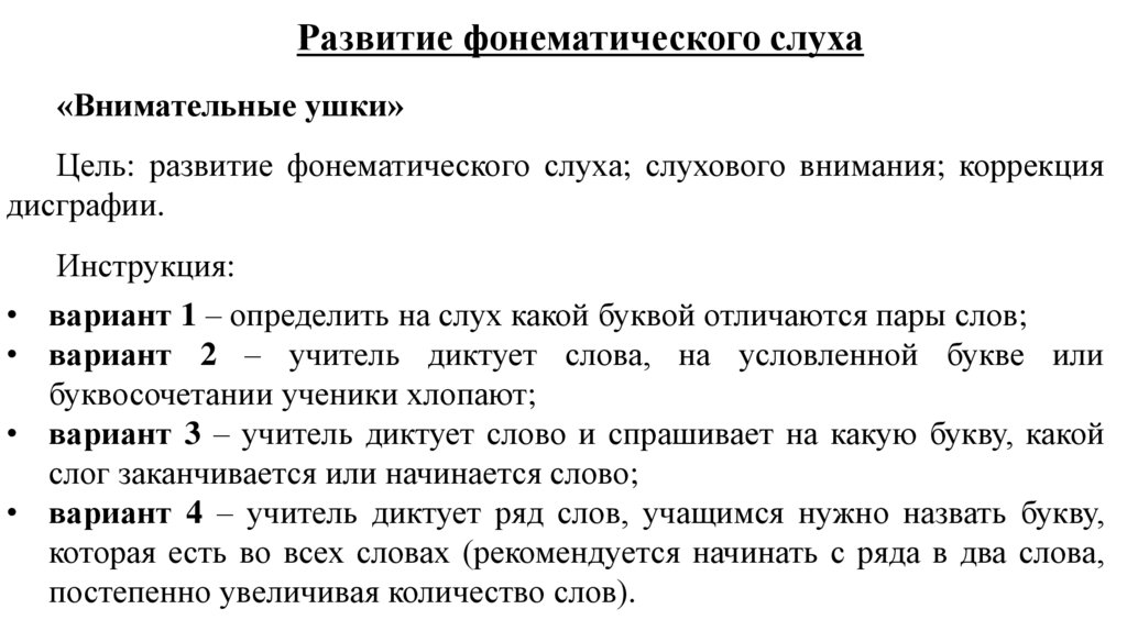 Цель: развитие фонематического слуха; слухового внимания; коррекция