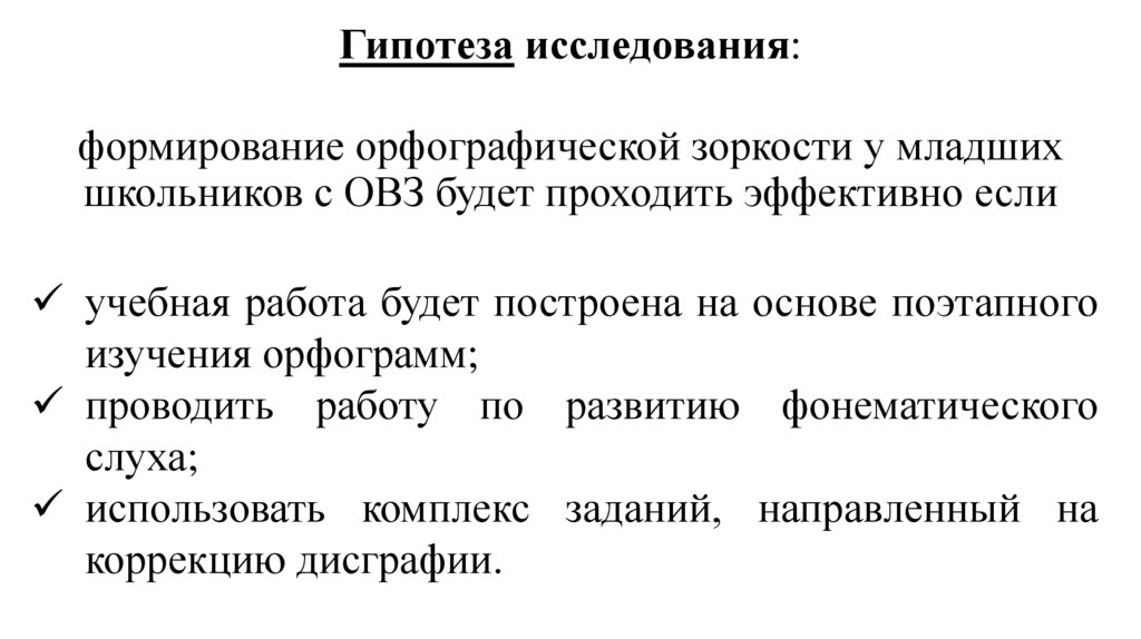 Гипотеза исследования:формирование орфографической зоркости у младших