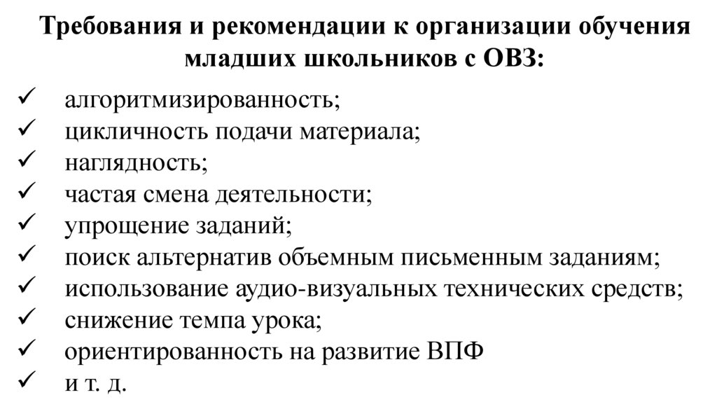 Требования и рекомендации к организации обучениямладших школьников с ОВЗ: