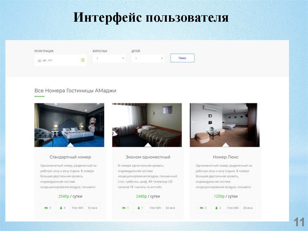 − Предоставление списка доступных к бронированию номеров,