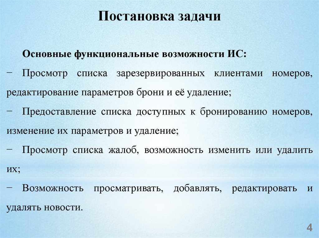 Постановка задачиОсновные функциональные возможности ИС: