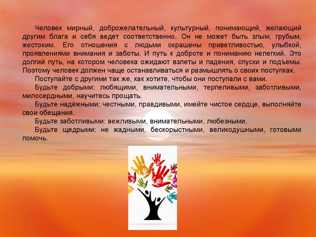 Человек мирный, доброжелательный, культурный, понимающий, желающийдругим блага и себя ведет соответственно. Он не может быть злым, грубым,