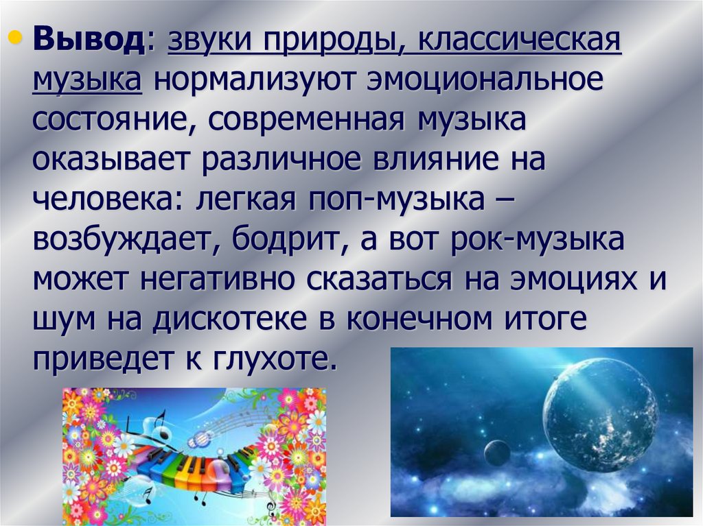 • Вывод: звуки природы, классическаямузыка нормализуют эмоциональное