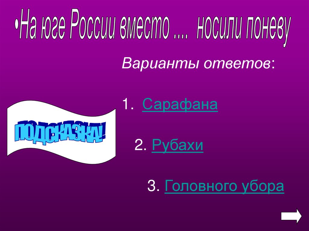 Варианты ответов:1. Сарафана