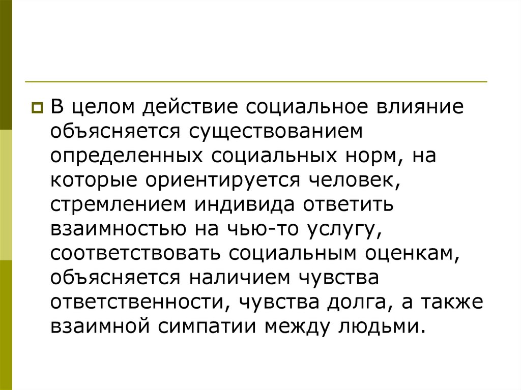 В целом действие социальное влияниеобъясняется существованием