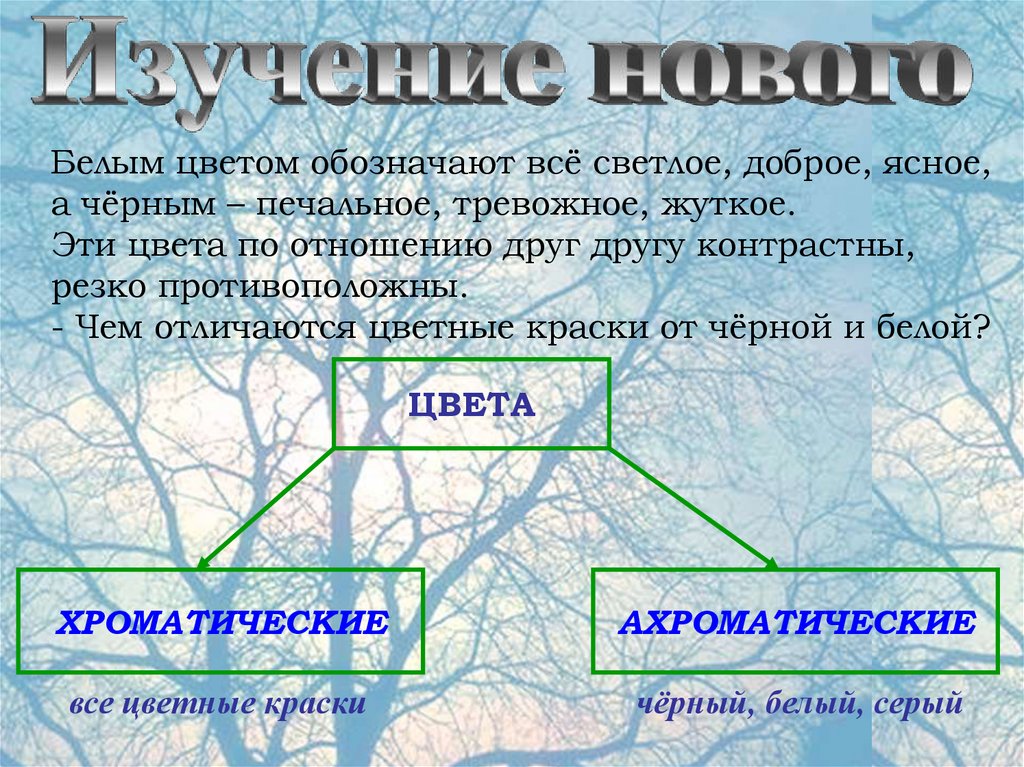 Белым цветом обозначают всё светлое, доброе, ясное,а чёрным – печальное, тревожное, жуткое.