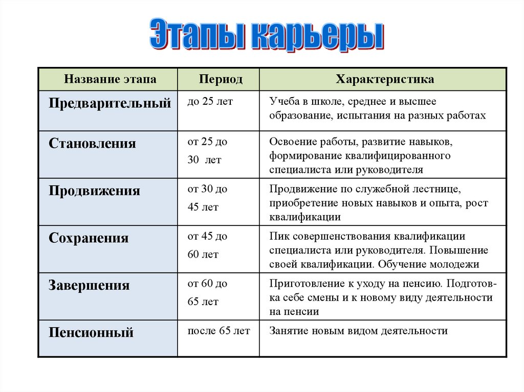 карьеры. Эти стадии конкретный работник