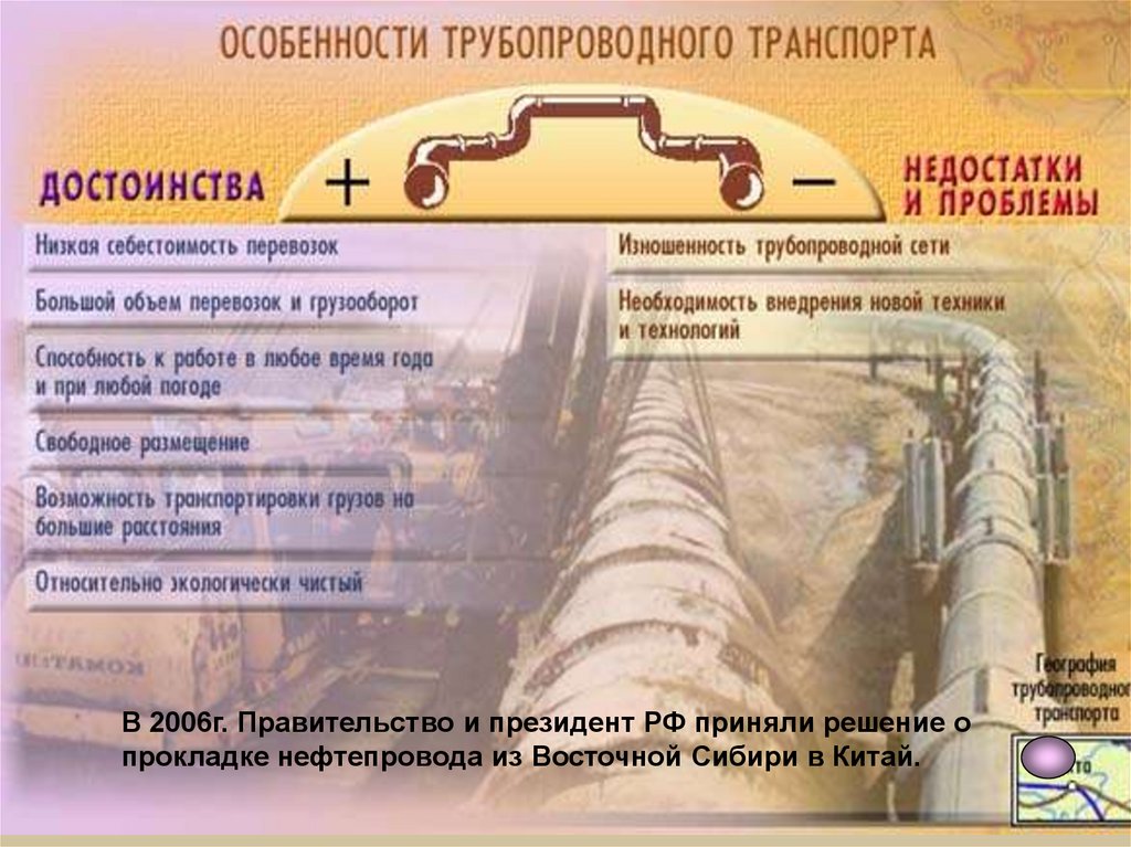 В 2006г. Правительство и президент РФ приняли решение опрокладке нефтепровода из Восточной Сибири в Китай.