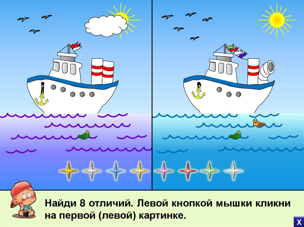 Найди 8 отличий. Левой кнопкой мышки кликнина первой (левой) картинке.