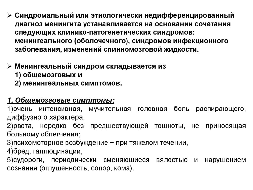 Синдромальный или этиологически недифференцированныйдиагноз менингита устанавливается на основании сочетания
